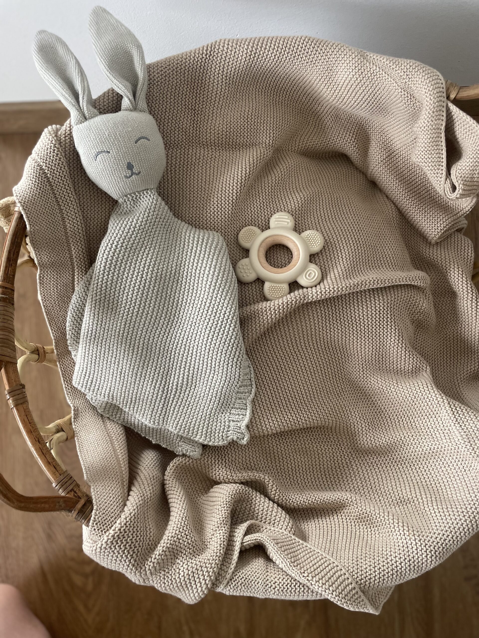 Podarite malčku popolno kombinacijo topline, nežnosti in praktičnosti – mehko pleteno odejico iz 100 % naravnega bombaža, ljubko ninico v obliki zajčka in grizalo iz dveh delov, ki ga lahko enostavno razstavite in operete.
