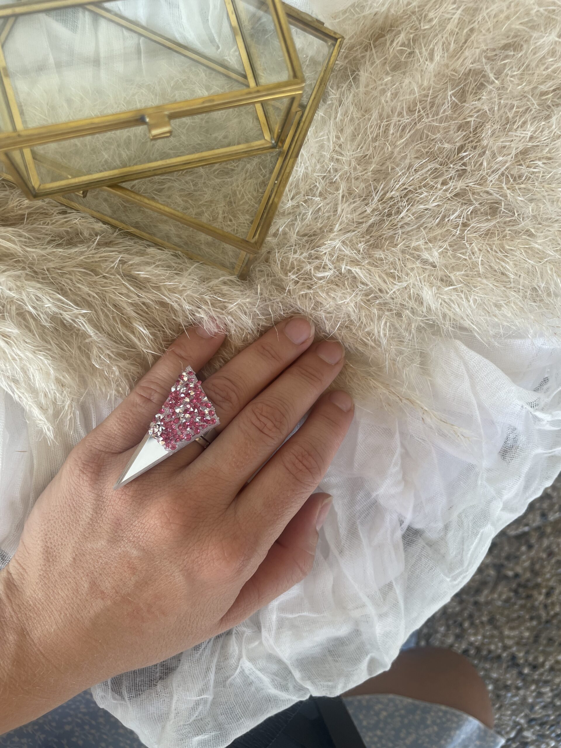 Unikatni prstan s srebrnim pleksi steklom, posut z nežnimi roza bleščicami, je popoln modni dodatek za vse, ki obožujete igrivost in eleganco v enem. 🌸